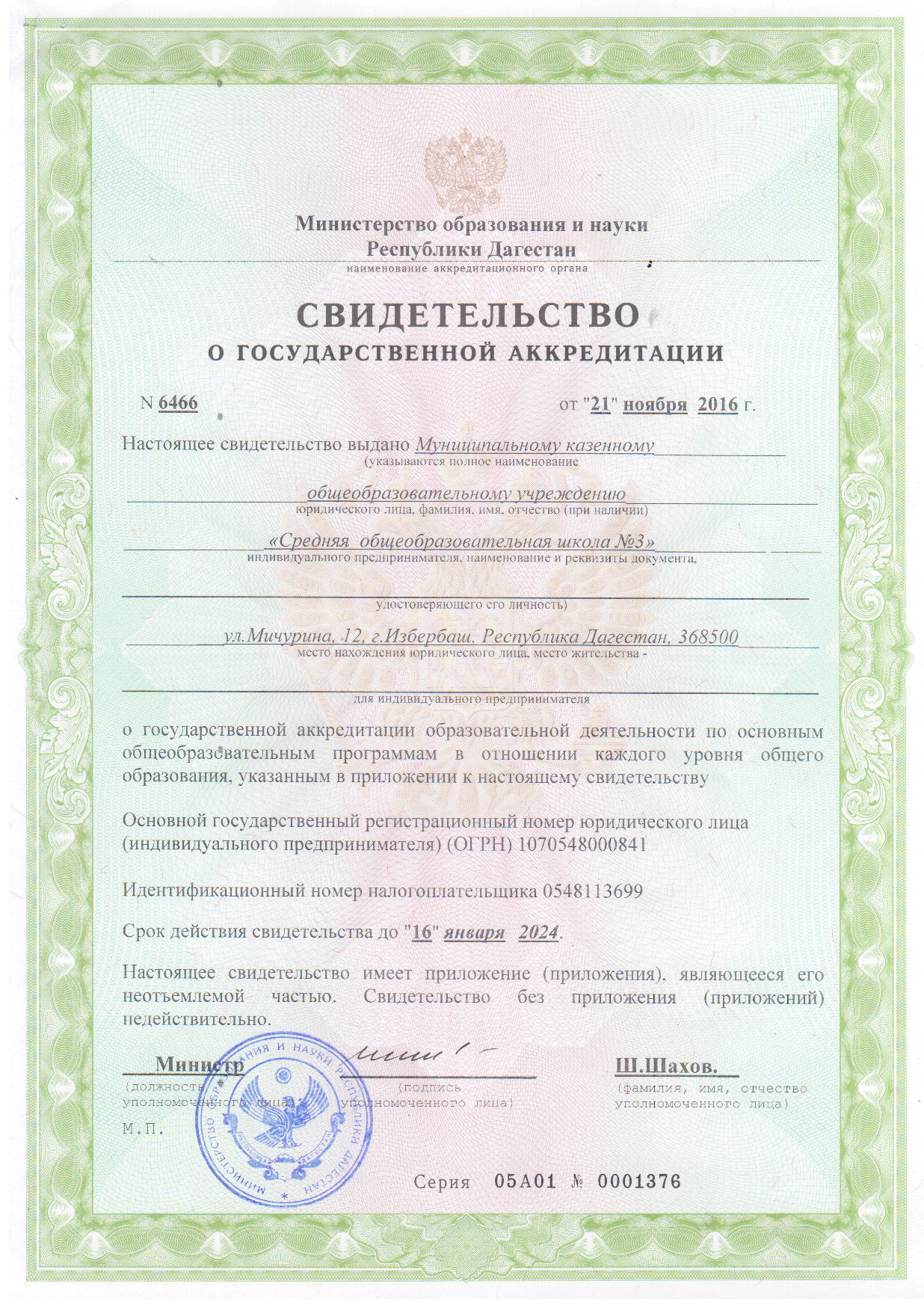 | Полное наименование образовательной организации* | Муниципальное казённое общеобразовательное учреждение «Средняя общеобразовательная школа №3» г. Избербаш Республики Дагестан |